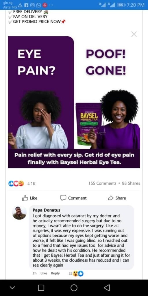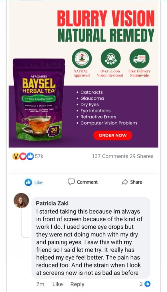 You have to get BAYSEL HERBAL TEA and use for 4 Weeks… and See how fast it clears up your stubborn eye problems — whether it’s Cataract, Glaucoma, blurry vision, eye redness, itching, or pressure in the eyes.